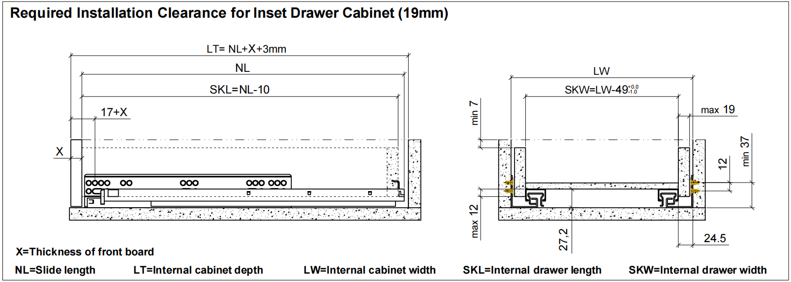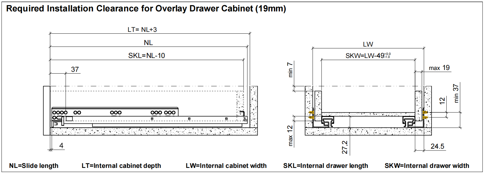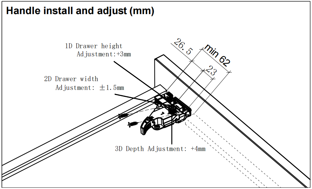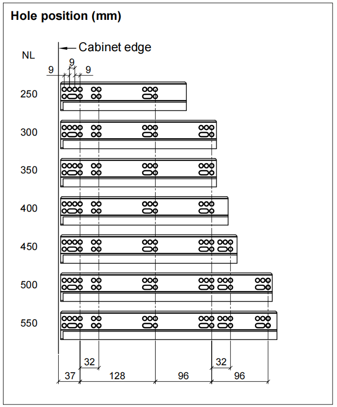 Full Extension More than 50,000 opening and closing tests with a load of 40KG Drawer height adjustment: 0~+3mm. Drawer width adjustment:±1.5mm. Package: 10 sets/Carton.